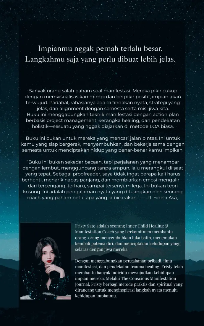 Dengan mengikuti langkah-langkah dalam jurnal ini, kamu akan memiliki sistem yang terstruktur dan berbasis ilmu untuk menyelaraskan energi, pikiran bawah sadar, dan tindakan nyata sehingga manifestasi tidak lagi menjadi sesuatu yang abstrak.