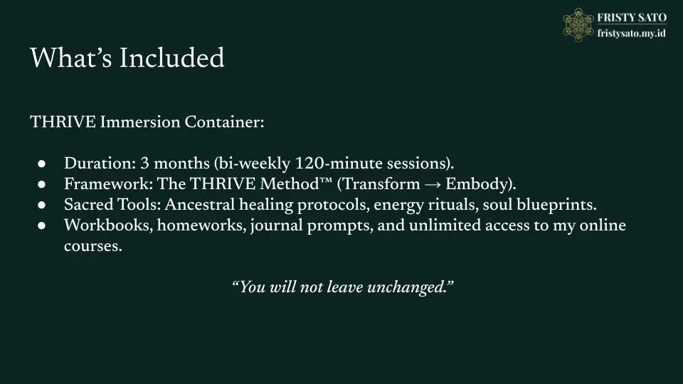 - Full THRIVE Method framework tailored to your soul’s current phase (this is your roadmap from feeling stuck to soul-led leadership).