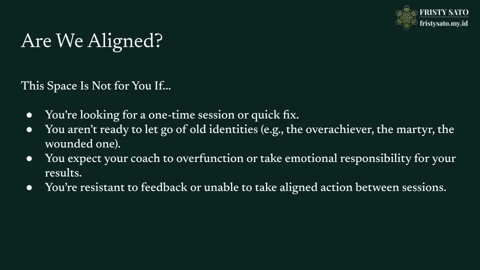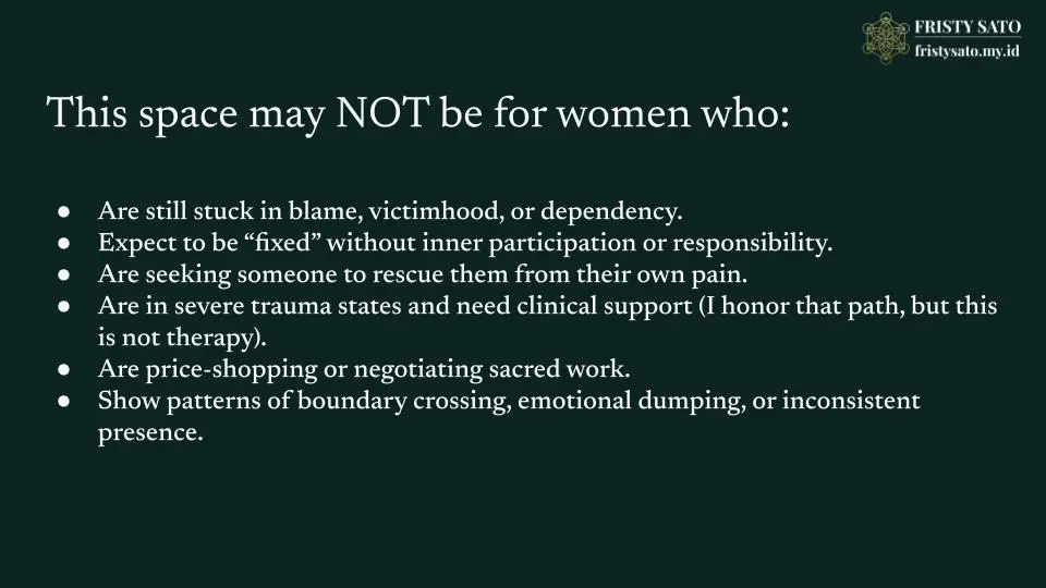 ⛔ Masculine Executive Coaching focused only on achievement. If your primary need is for a coach to build a tactical roadmap or increase profit margins without soul-led intention, this space will not serve you.